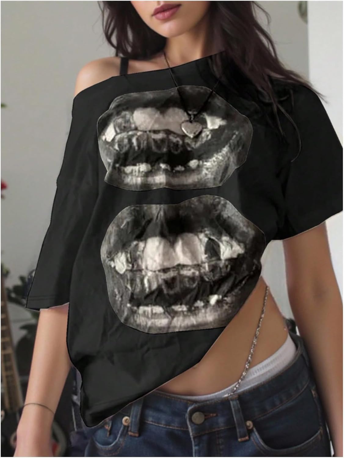QJQ Women’s Lip Graphic T Shirts Short Sleeve Crewneck Y2k Baggy Loose Tee Cute Tops Going Out Tops Summer Streetwear 2026