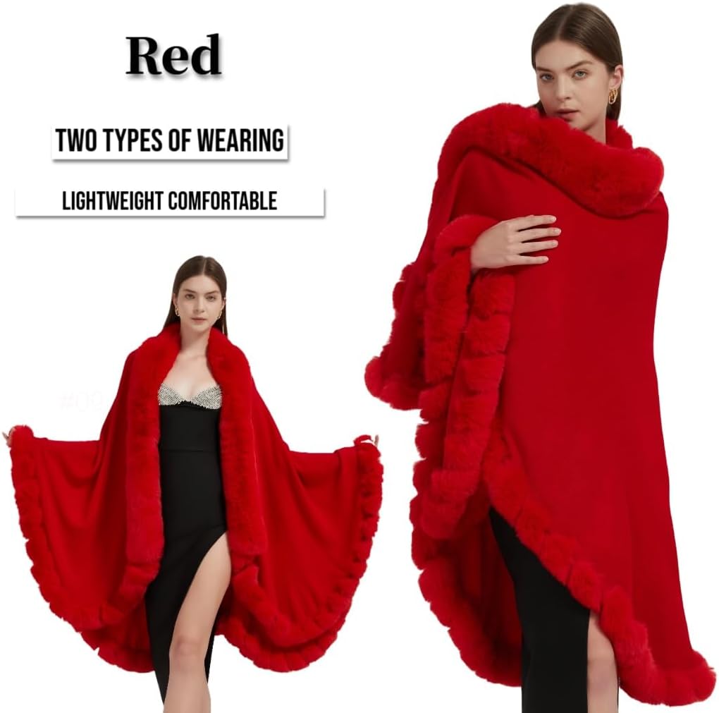 Tngan Faux Fox Fur Trim Cardigan Cloak Shawl Wraps Winter Poncho Oversized Cape